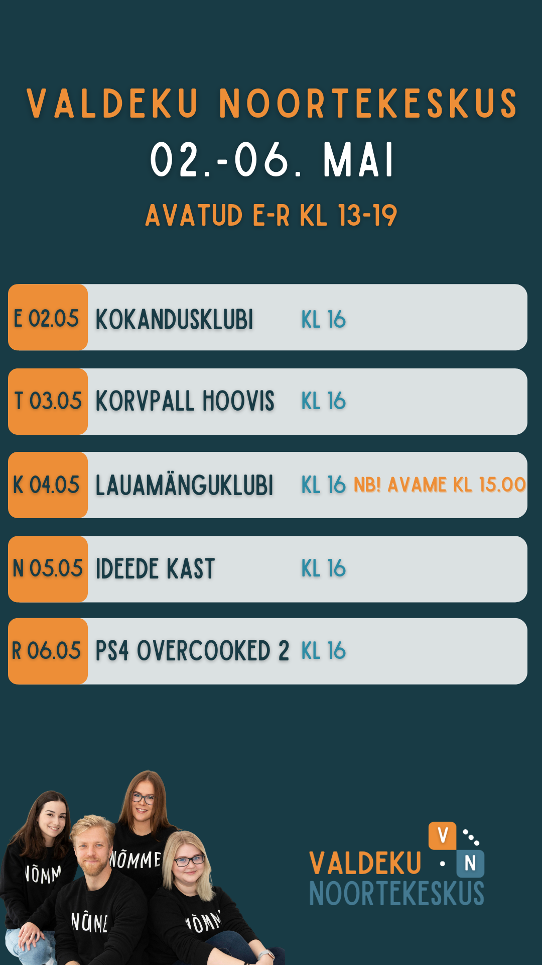 Nõmme Vaba Aja Keskus → Valdeku noortekeskus → Sündmused → 02.-05. mai