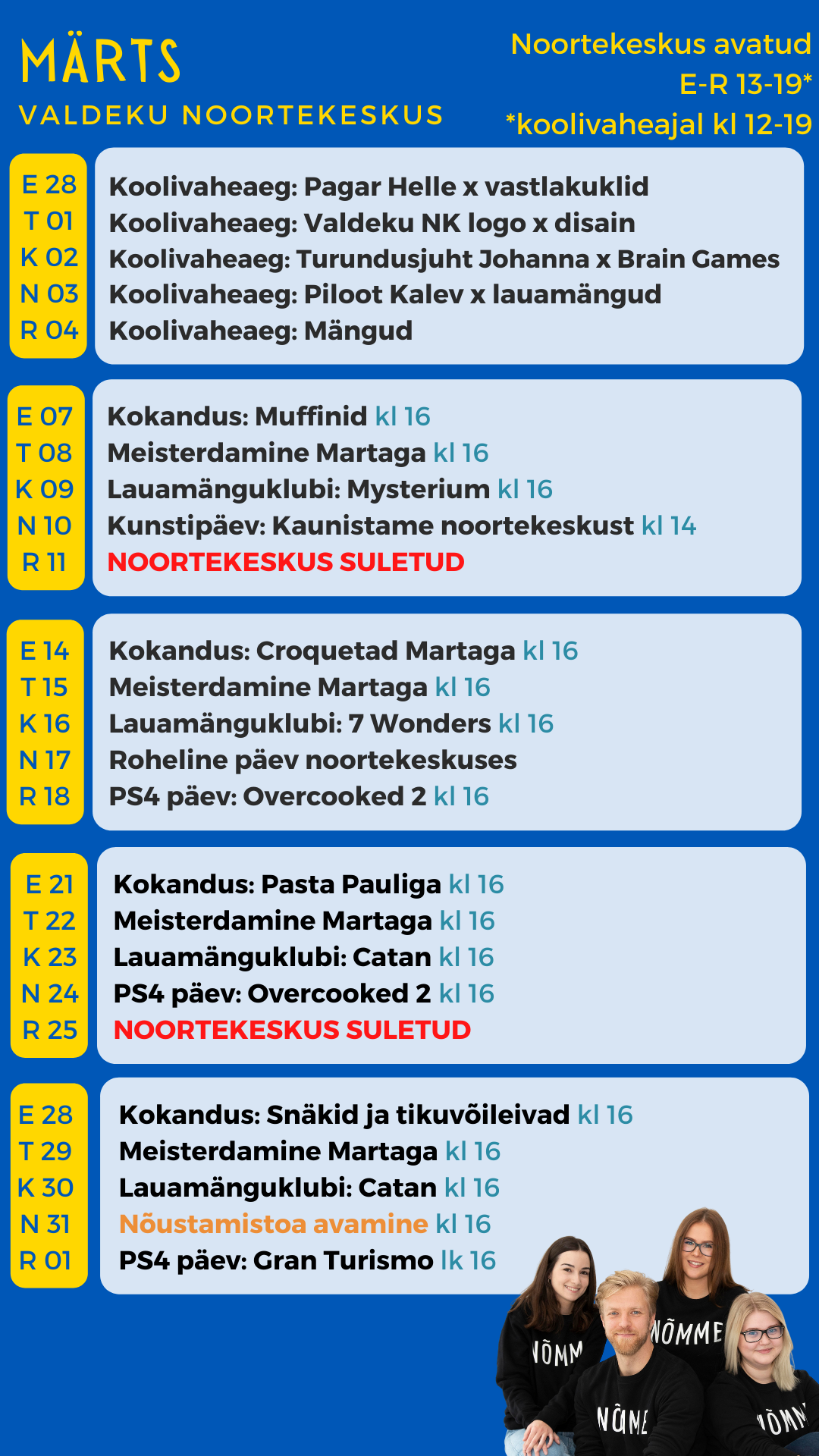 Nõmme Vaba Aja Keskus → Valdeku noortekeskus → Sündmused → Valdeku Noortekeskuse märtsi kuukava